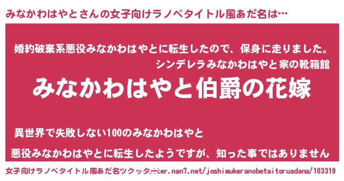| 男性向けラノベタイトル風あだ名 | 『やはりみなかわはやとの青春ラブコメはまちがっている 』 |