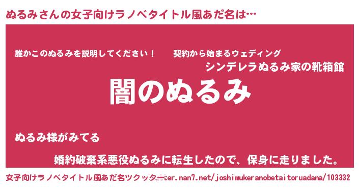| 男性向けラノベタイトル風あだ名 | 『Re:ぬるみから始める異世界生活』 |