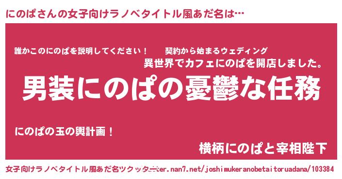 | 男性向けラノベタイトル風あだ名 | 『うちのにのぱが世界を掌握している!』 |