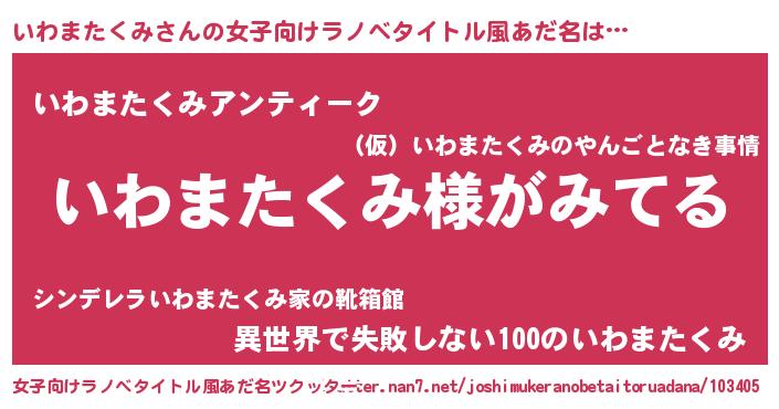 | 男性向けラノベタイトル風あだ名 | 『いわまたくみの嫁は女の子じゃないと思った?』 |