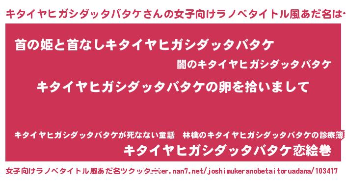 | 男性向けラノベタイトル風あだ名 | 『キタイヤヒガシダッタバタケの嫁は女の子じゃないと思った?』 |