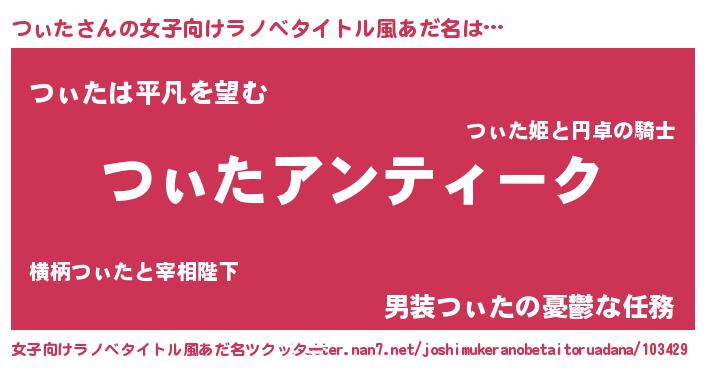 つぃたさんの女子向けラノベタイトル風あだ名は… 『つぃたアンティーク』『つぃたは平凡を望む』『男装つぃたの憂鬱な任務』 ツクッター #女子向けラノベタイトル風あだ名ツクッター http://tkutter.nan7.net/joshimukeranobetaitoruadana/103429/