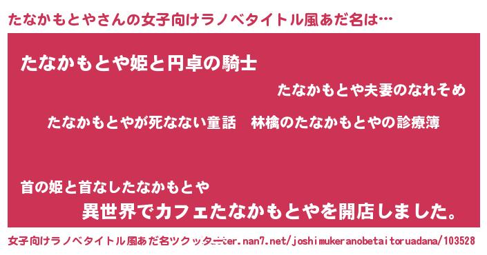 | 男性向けラノベタイトル風あだ名 | 『魔弾の王とたなかもとや』 |