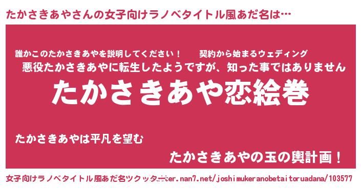 | 男性向けラノベタイトル風あだ名 | 『おまえをオタクにしてやるから、俺をたかさきあやにしてくれ! 』 |