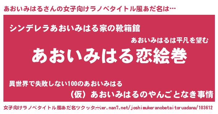 | 男性向けラノベタイトル風あだ名 | 『おまえをオタクにしてやるから、俺をあおいみはるにしてくれ! 』 |