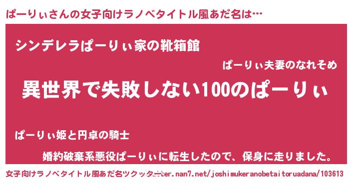 | 男性向けラノベタイトル風あだ名 | 『ぱーりぃという概念が存在しない退屈な世界 』 |