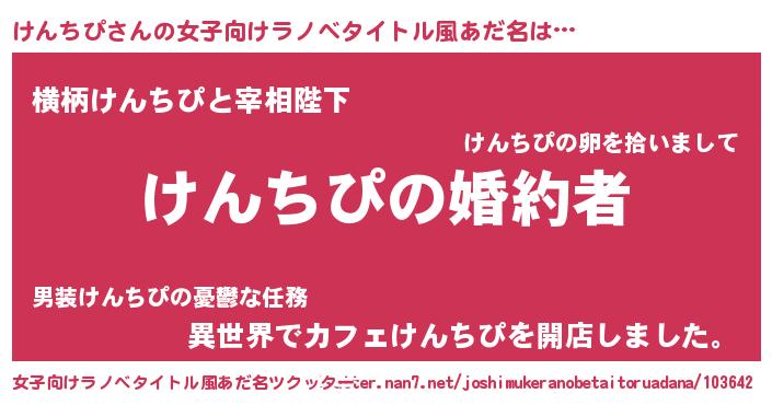 けんちぴさんの女子向けラノベタイトル風あだ名は… 『けんちぴの婚約者』『横柄けんちぴと宰相陛下』『異世界でカフェけんちぴを開店しました。』 ツクッター #女子向けラノベタイトル風あだ名ツクッター http://tkutter.nan7.net/joshimukeranobetaitoruadana/103642/