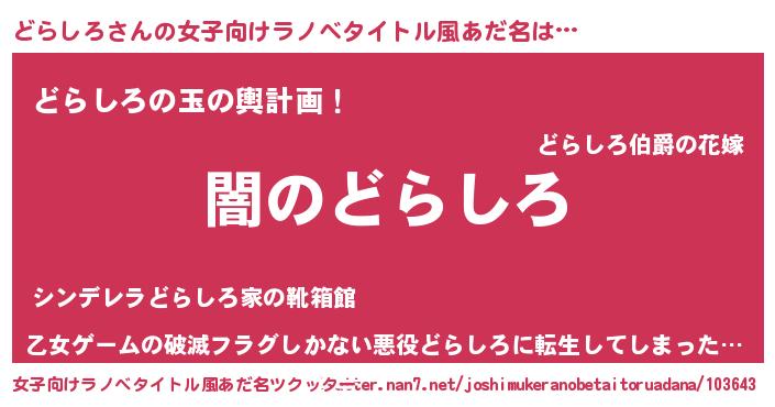 | 男性向けラノベタイトル風あだ名 | 『Re:どらしろから始める異世界生活』 |