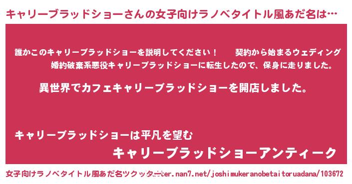 | 男性向けラノベタイトル風あだ名 | 『誰もが恐れるあのキャリーブラッドショーが、ぼくの専属メイドになるようです。』 |