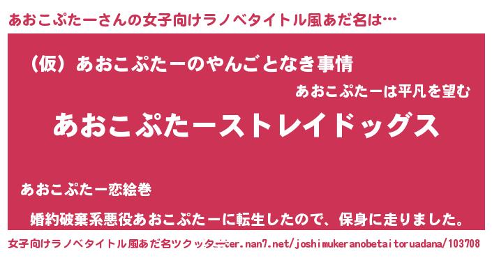 | 男性向けラノベタイトル風あだ名 | 『Re:あおこぷたーから始める異世界生活』 |