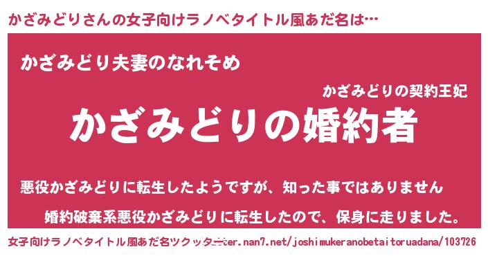 かざみどりさんの女子向けラノベタイトル風あだ名は… 『かざみどりの婚約者』『かざみどり夫妻のなれそめ』『婚約破棄系悪役かざみどりに転生したので、保身に走りました。』 ツクッター #女子向けラノベタイトル風あだ名ツクッター http://tkutter.nan7.net/joshimukeranobetaitoruadana/103726/