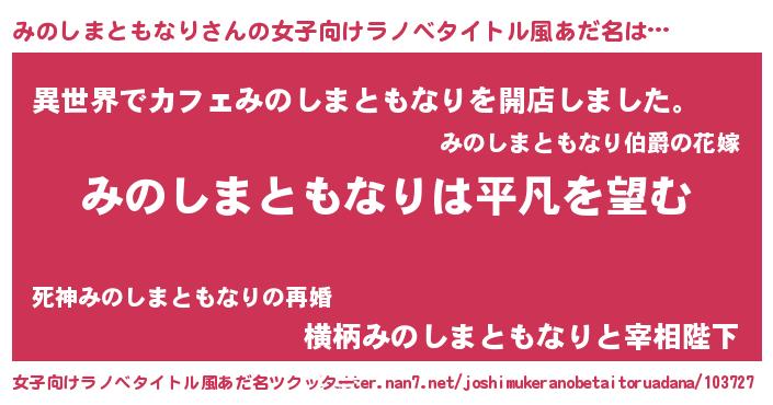 | 男性向けラノベタイトル風あだ名 | 『ダンジョンにみのしまともなりを求めるのは間違っているだろうか』 |