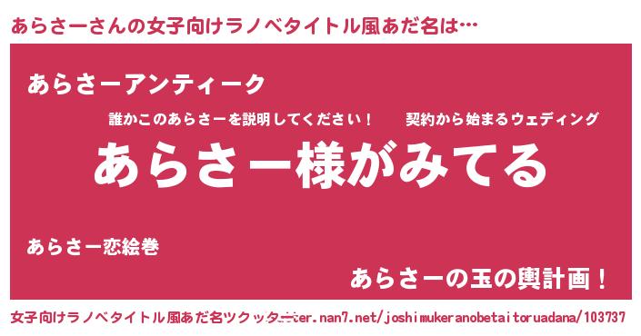 | 男性向けラノベタイトル風あだ名 | 『あらさーの嫁は女の子じゃないと思った?』 |