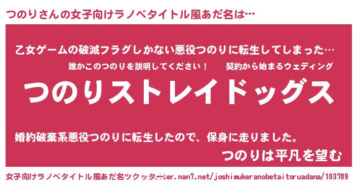 | 男性向けラノベタイトル風あだ名 | 『Re:つのりから始める異世界生活』 |