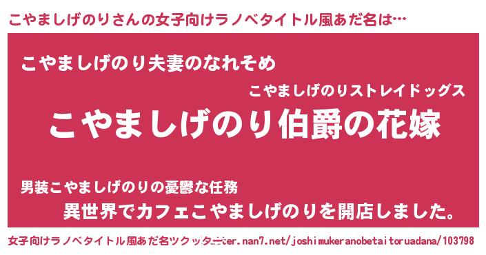 | 男性向けラノベタイトル風あだ名 | 『うちの娘の為ならば、俺はもしかしたらこやましげのりも倒せるかもしれない。』 |