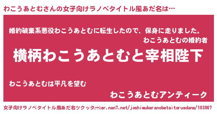 | 男性向けラノベタイトル風あだ名 | 『わこうあとむに滅ぼされるだけの簡単なお仕事です』 |