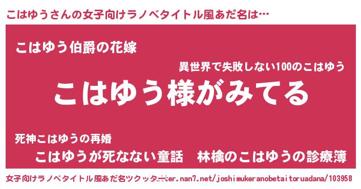 | 男性向けラノベタイトル風あだ名 | 『こはゆうの嫁は女の子じゃないと思った?』 |