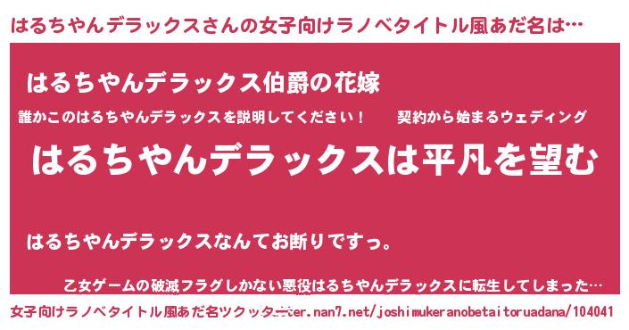 | 胡散臭い通販商品みたいなあだ名 | 『信頼と実績のサプリメント…その名も「はるちやんデラックス」』 |