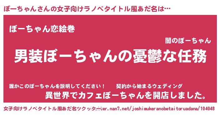 | 男性向けラノベタイトル風あだ名 | 『うちのぼーちゃんが世界を掌握している!』 |