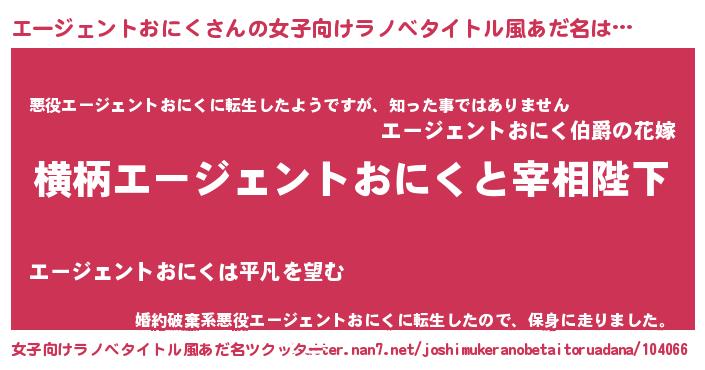 | 男性向けラノベタイトル風あだ名 | 『エージェントおにくに滅ぼされるだけの簡単なお仕事です』 |