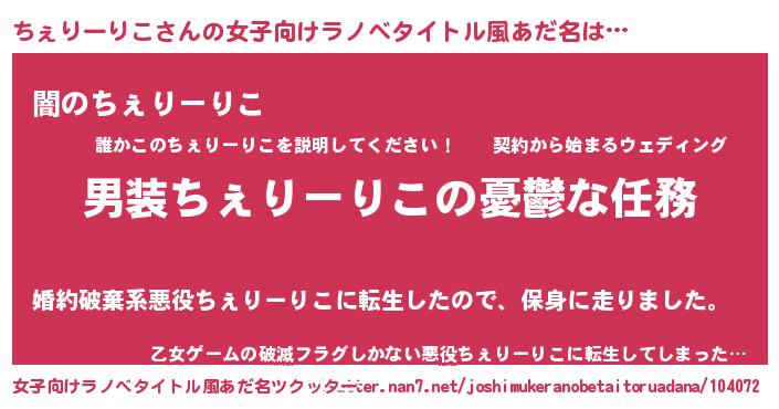ちぇりーりこさんの女子向けラノベタイトル風あだ名は… 『男装ちぇりーりこの憂鬱な任務』『闇のちぇりーりこ』『乙女ゲームの破滅フラグしかない悪役ちぇりーりこに転生してしまった…』 ツクッター #女子向けラノベタイトル風あだ名ツクッター http://tkutter.nan7.net/joshimukeranobetaitoruadana/104072/