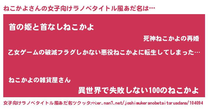 | 男性向けラノベタイトル風あだ名 | 『この素晴らしい世界にねこかよを!』 |
