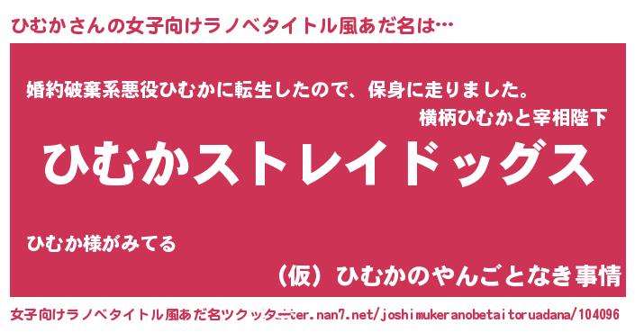 | 男性向けラノベタイトル風あだ名 | 『Re:ひむかから始める異世界生活』 |