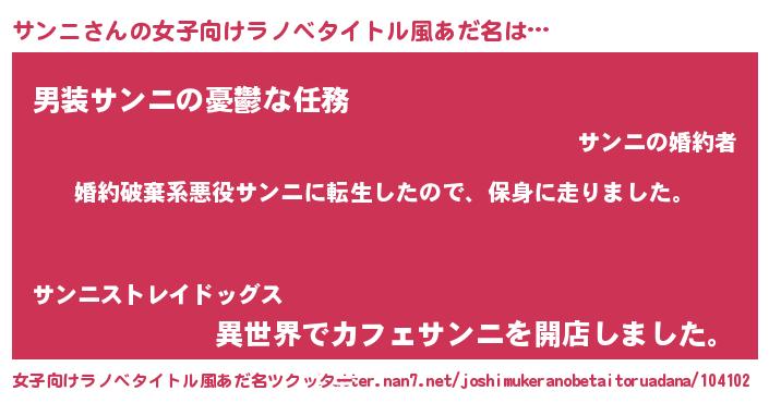 サンニさんの女子向けラノベタイトル風あだ名は… 『婚約破棄系悪役サンニに転生したので、保身に走りました。』『男装サンニの憂鬱な任務』『異世界でカフェサンニを開店しました。』 ツクッター #女子向けラノベタイトル風あだ名ツクッター http://tkutter.nan7.net/joshimukeranobetaitoruadana/104102/