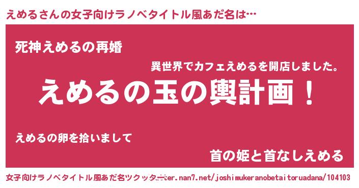 | 男性向けラノベタイトル風あだ名 | 『えめる~年齢イコール彼女いない歴の魔法使い~』 |