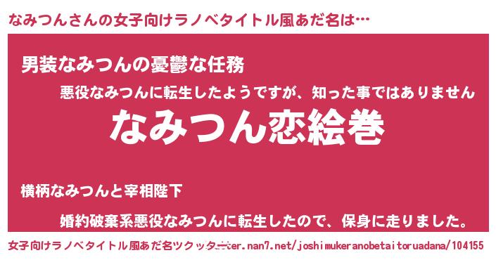 なみつんさんの女子向けラノベタイトル風あだ名は… 『なみつん恋絵巻』『男装なみつんの憂鬱な任務』『婚約破棄系悪役なみつんに転生したので、保身に走りました。』 ツクッター #女子向けラノベタイトル風あだ名ツクッター http://tkutter.nan7.net/joshimukeranobetaitoruadana/104155/