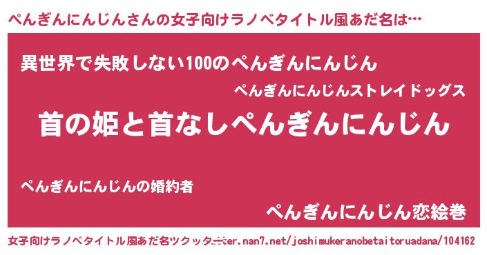 | 男性向けラノベタイトル風あだ名 | 『はたらくぺんぎんにんじんさま!』 |