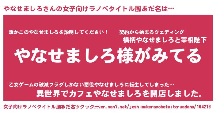 | 男性向けラノベタイトル風あだ名 | 『やなせましろの嫁は女の子じゃないと思った?』 |