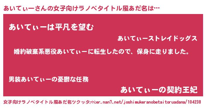 あいてぃーさんの女子向けラノベタイトル風あだ名は… 『婚約破棄系悪役あいてぃーに転生したので、保身に走りました。』『あいてぃーは平凡を望む』『あいてぃーの契約王妃』 ツクッター #女子向けラノベタイトル風あだ名ツクッター http://tkutter.nan7.net/joshimukeranobetaitoruadana/104238/