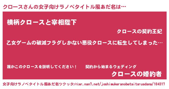 | 男性向けラノベタイトル風あだ名 | 『この素晴らしい世界にクロースを!』 |