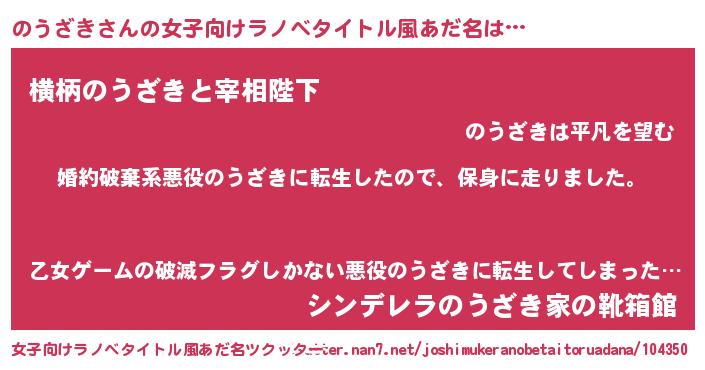 | 男性向けラノベタイトル風あだ名 | 『転生したらのうざきだった件』 |