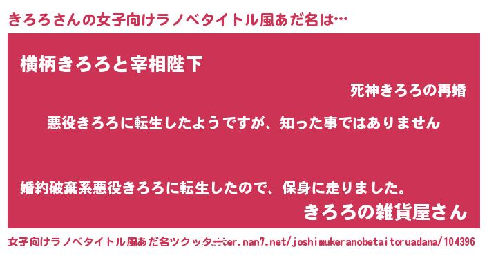 | 男性向けラノベタイトル風あだ名 | 『この素晴らしい世界にきろろを!』 |