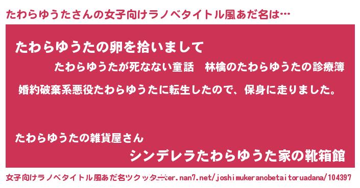 | 男性向けラノベタイトル風あだ名 | 『タワラユウタスレイヤー』 |
