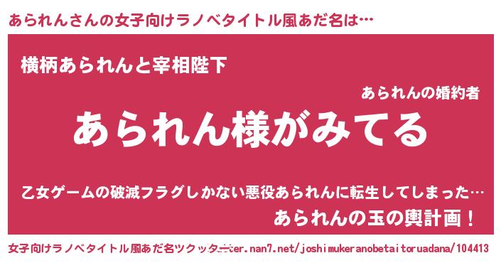 | 男性向けラノベタイトル風あだ名 | 『あられんの嫁は女の子じゃないと思った?』 |
