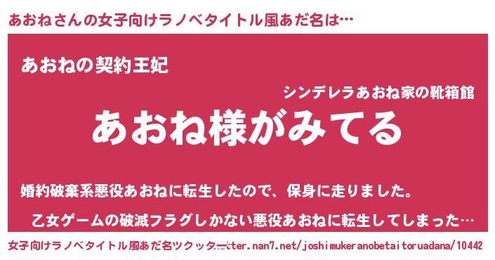 | 男性向けラノベタイトル風あだ名 | 『あおねの嫁は女の子じゃないと思った?』 |