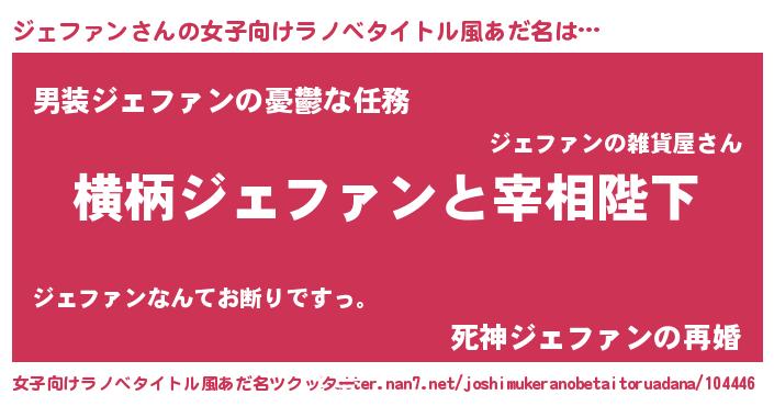 | 男性向けラノベタイトル風あだ名 | 『ジェファンに滅ぼされるだけの簡単なお仕事です』 |