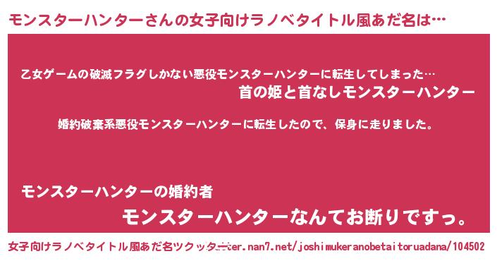 | 男性向けラノベタイトル風あだ名 | 『転生したらモンスターハンターだった件』 |