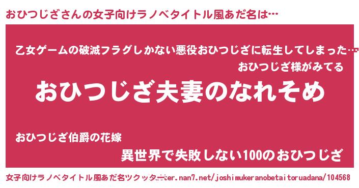 | 男性向けラノベタイトル風あだ名 | 『おまえをオタクにしてやるから、俺をおひつじざにしてくれ! 』 |