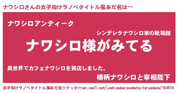 ナワシロさんの女子向けラノベタイトル風あだ名は… 『ナワシロ様がみてる』『ナワシロアンティーク』『横柄ナワシロと宰相陛下』 ツクッター #女子向けラノベタイトル風あだ名ツクッター http://tkutter.nan7.net/joshimukeranobetaitoruadana/104574/