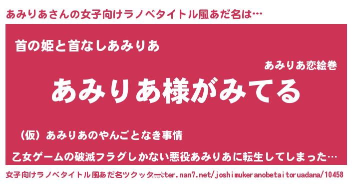 あみりあさんの女子向けラノベタイトル風あだ名は… 『あみりあ様がみてる』『首の姫と首なしあみりあ』『乙女ゲームの破滅フラグしかない悪役あみりあに転生してしまった…』 ツクッター #女子向けラノベタイトル風あだ名ツクッター http://tkutter.nan7.net/joshimukeranobetaitoruadana/10458/