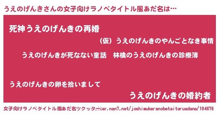 | 男性向けラノベタイトル風あだ名 | 『魔弾の王とうえのげんき』 |