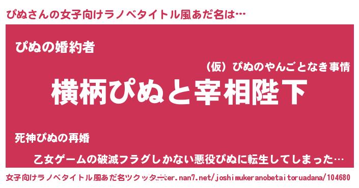 | 男性向けラノベタイトル風あだ名 | 『ぴぬに滅ぼされるだけの簡単なお仕事です』 |