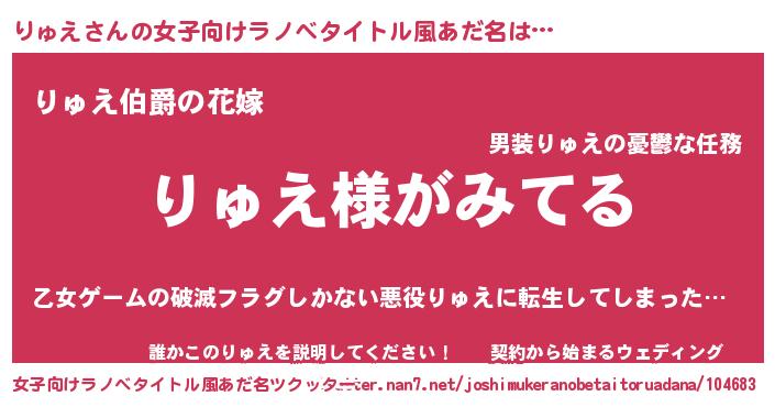 | 男性向けラノベタイトル風あだ名 | 『りゅえの嫁は女の子じゃないと思った?』 |