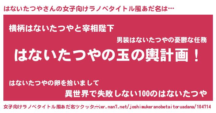 | 男性向けラノベタイトル風あだ名 | 『はないたつや~年齢イコール彼女いない歴の魔法使い~』 |