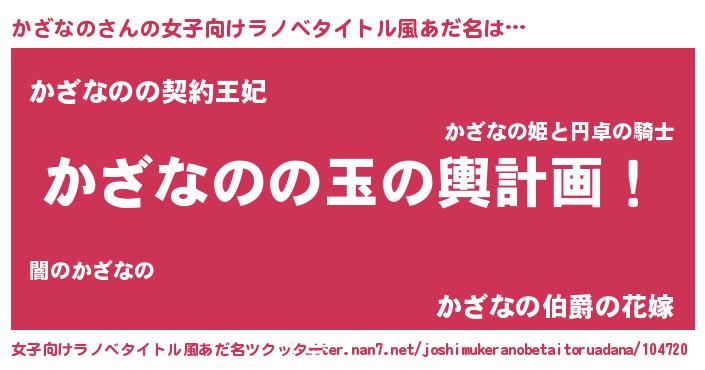 かざなのさんの女子向けラノベタイトル風あだ名は… 『かざなのの玉の輿計画!』『かざなのの契約王妃』『かざなの伯爵の花嫁』 ツクッター #女子向けラノベタイトル風あだ名ツクッター http://tkutter.nan7.net/joshimukeranobetaitoruadana/104720/