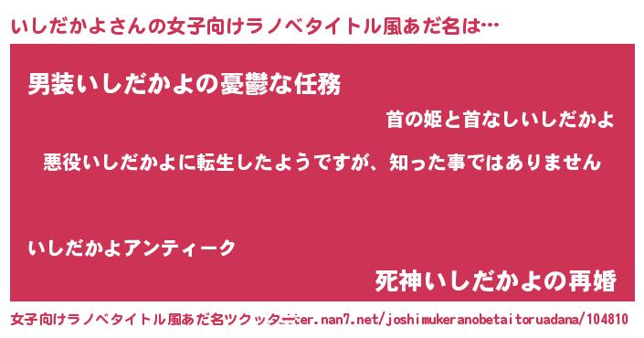 | 男性向けラノベタイトル風あだ名 | 『この素晴らしい世界にいしだかよを!』 |
